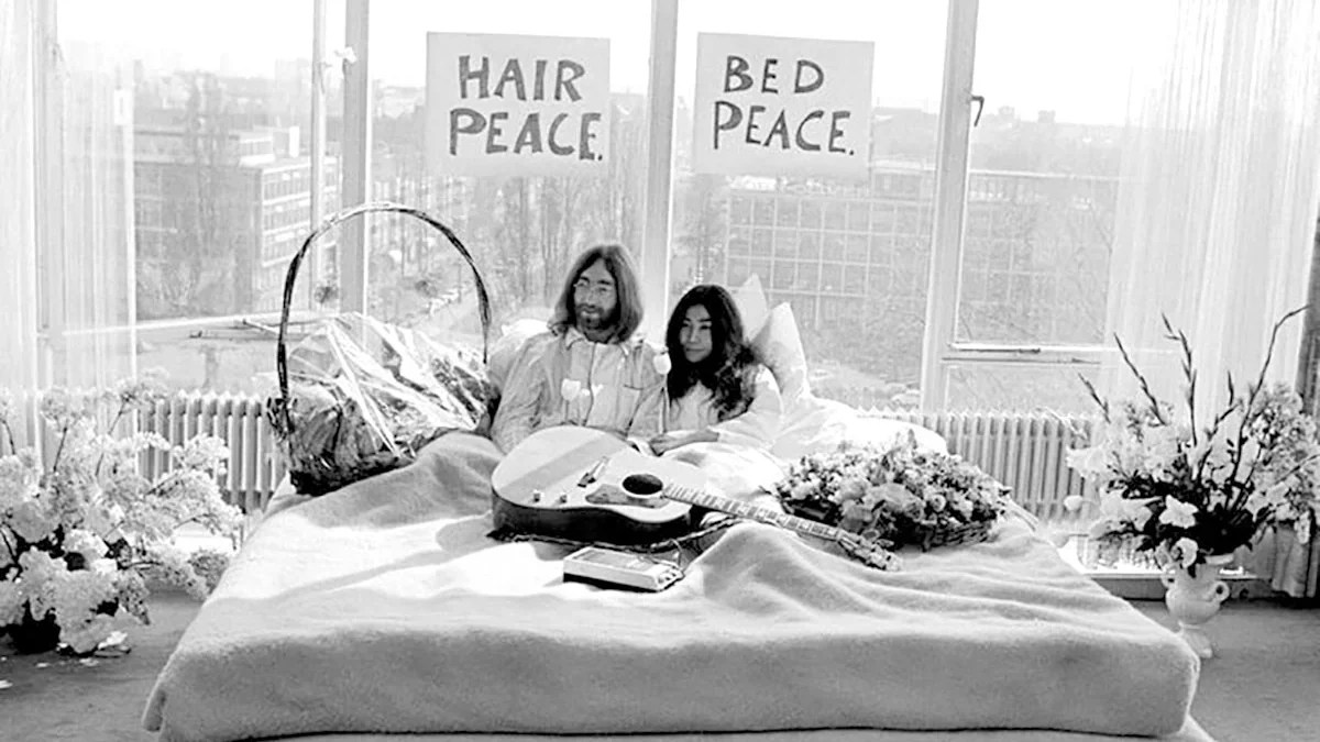 Après leur mariage à Gibraltar en mars 1969, John et Yoko organisent un premier Bed-In à Amsterdam. L’idée est inédite : rester au lit pendant une semaine dans une chambre d’hôtel, en robe de chambre blanche, et inviter la presse à venir les interroger. Une forme de protestation passive, inspirée par les méthodes de Gandhi.
