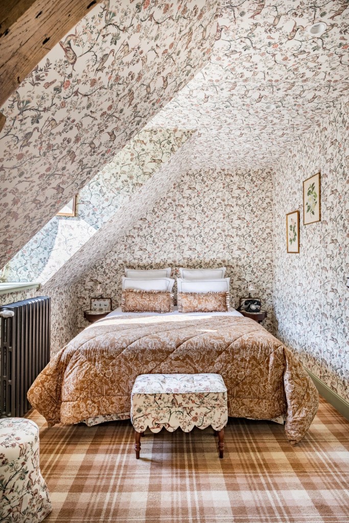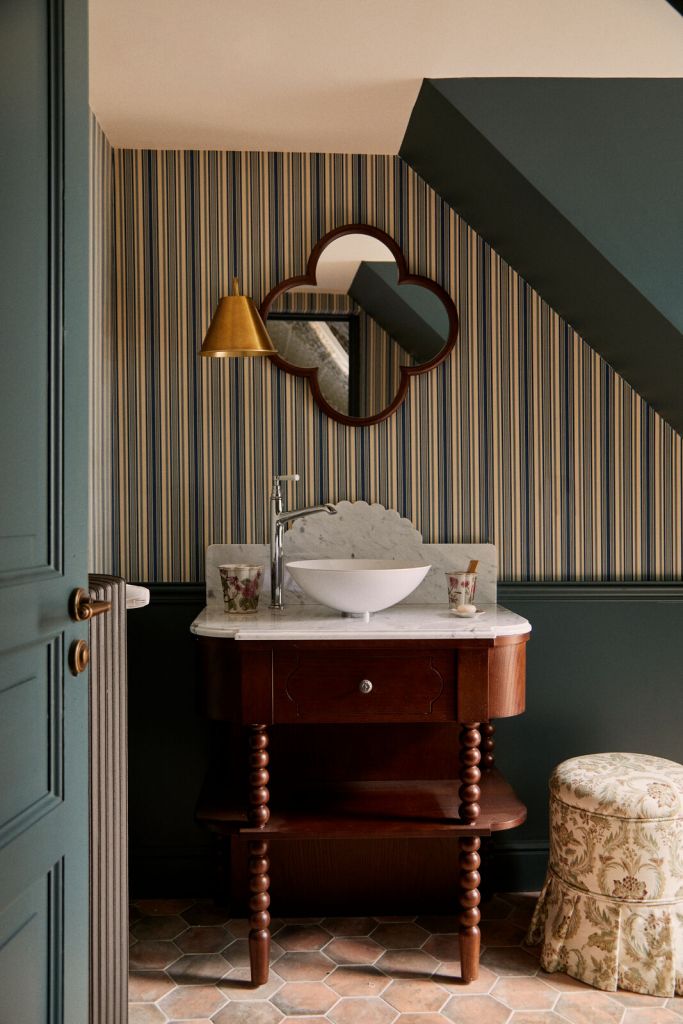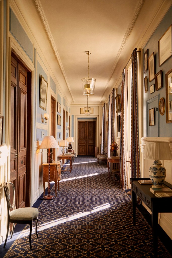 La décoration, signée Cordélia de Castellane, revisite l’univers de la country house anglaise avec un œil français : papiers peints fleuris, meubles chinés, boiseries anciennes, velours poudrés, lampes sculpturales. Rien n’est figé, tout respire une forme de luxe sensible, propice à la lenteur et à la rêverie.
