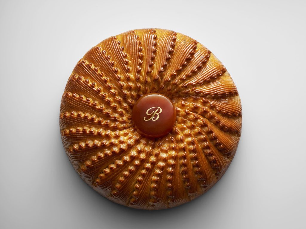 La galette se distingue non seulement par sa texture croustillante à l’extérieur, moelleuse à l’intérieur, mais aussi par la manière dont elle évoque un bijou de fête, fidèle au nom qu’elle porte. C’est une lecture très contemporaine de la tradition, où la structure artistique s’accorde à la richesse des saveurs pour offrir une expérience plus proche de la haute pâtisserie que du simple gâteau de saison.